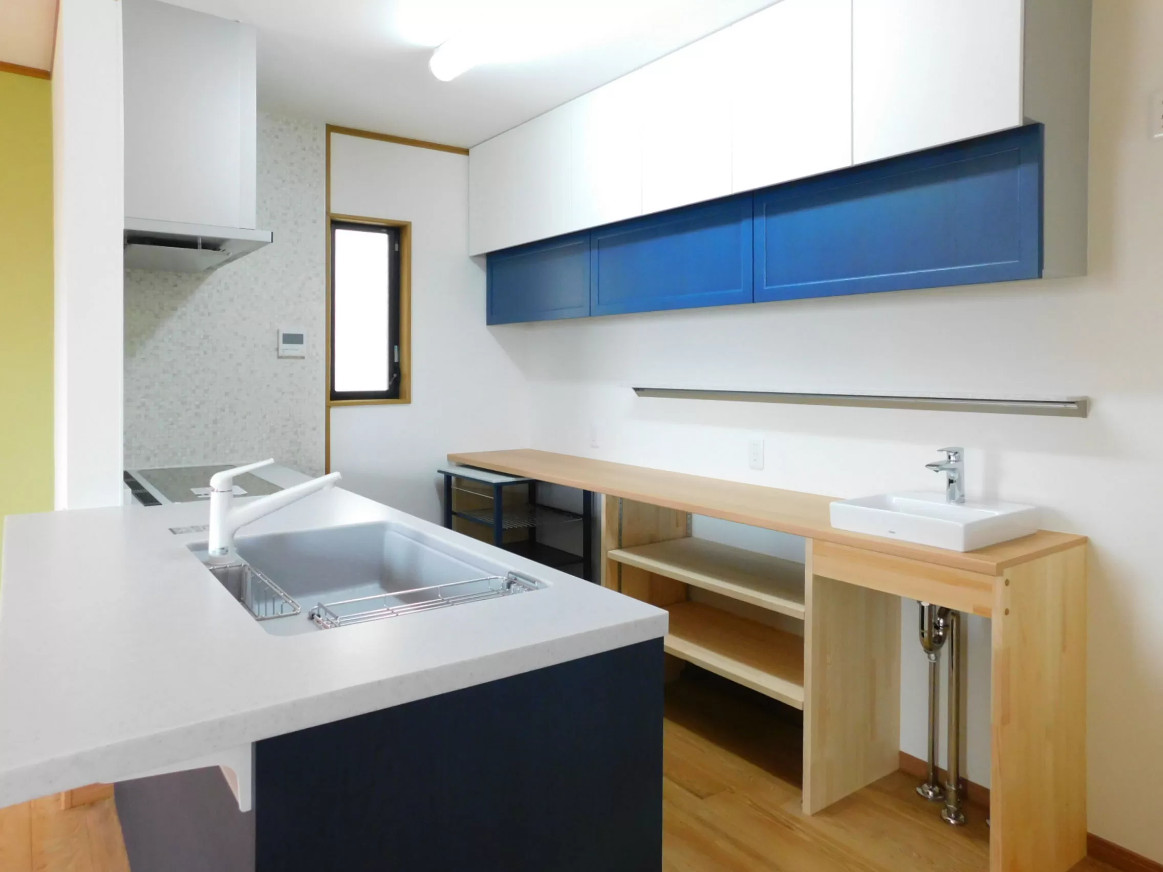 キッチンの背面には作業カウンター兼サブシンクがあり、お客様のスケッチを元に大工さんで作製させていただきました。