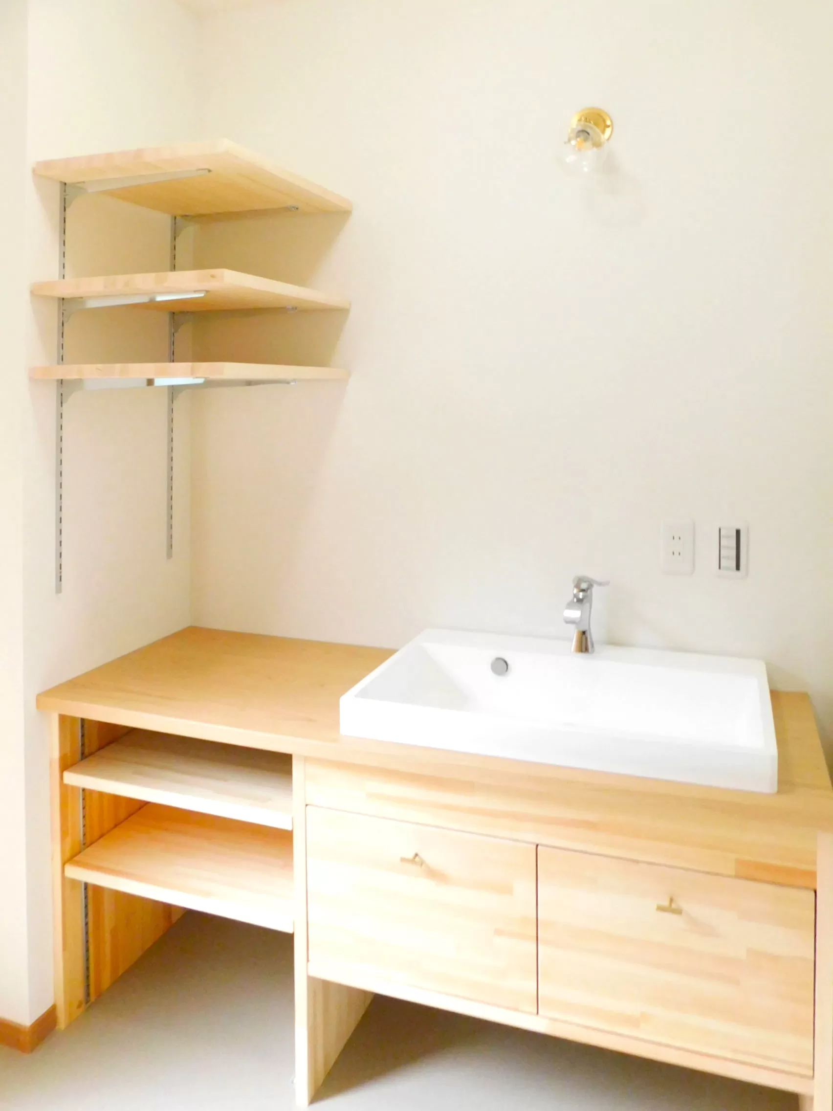 洗面台はカウンター部分を広げ、タオルなどを収納出来るように収納棚も取付ました。