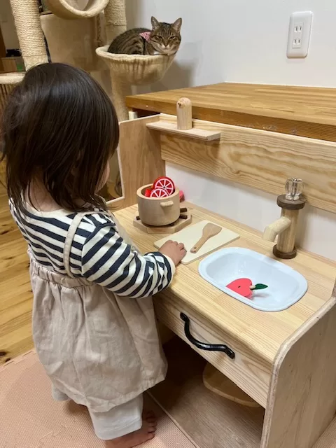 また、今打ち合わせ中のお客様の所にも持っていきましたが、すごく人見知りだと伺っていたお子さんもキッチンに興味津々で、すぐその場で遊び初めてくれて、その姿がすごく可愛く、ミニキッチンのサイズもピッタリで微笑ましかったです。