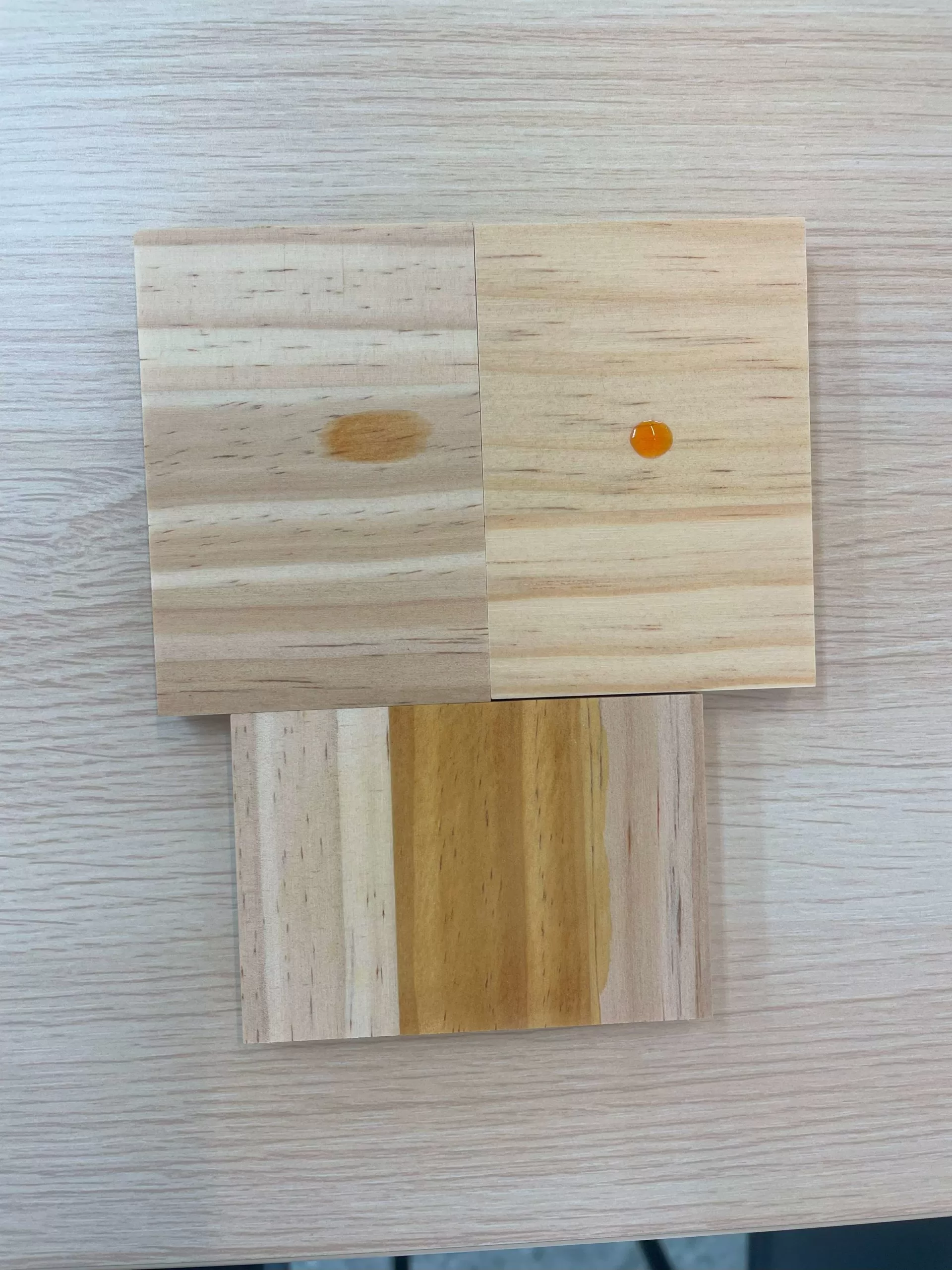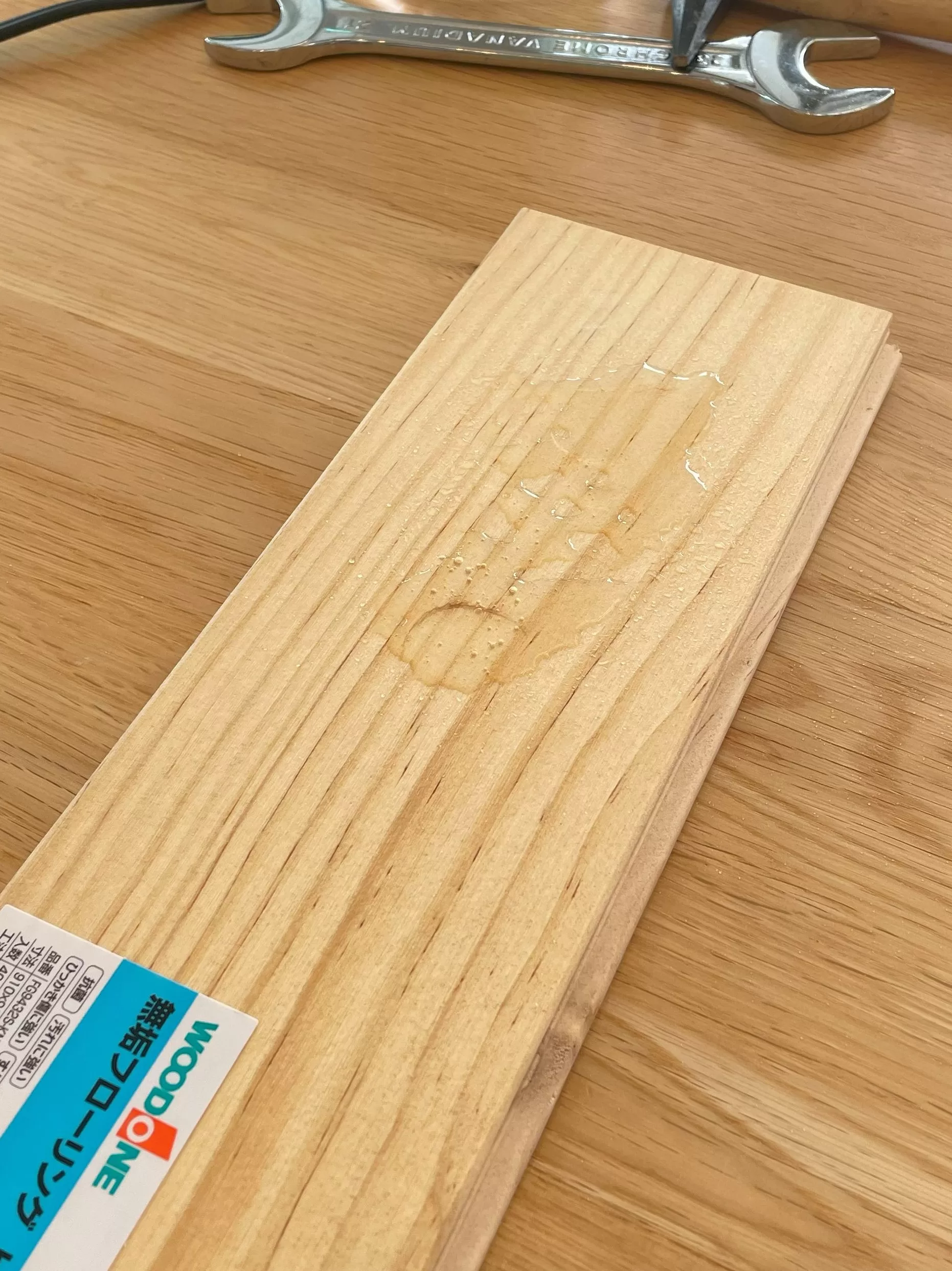 無垢のキッチンは汚れやすいんじゃないかという心配もあると思いますが、6段階に塗装していて、ついてしまった油汚れもさっと拭きとるだけで汚れが落るということで、研修ではキッチンの扉材と無垢の木の上にラー油をたらし、どれほどの差があるのか検証。