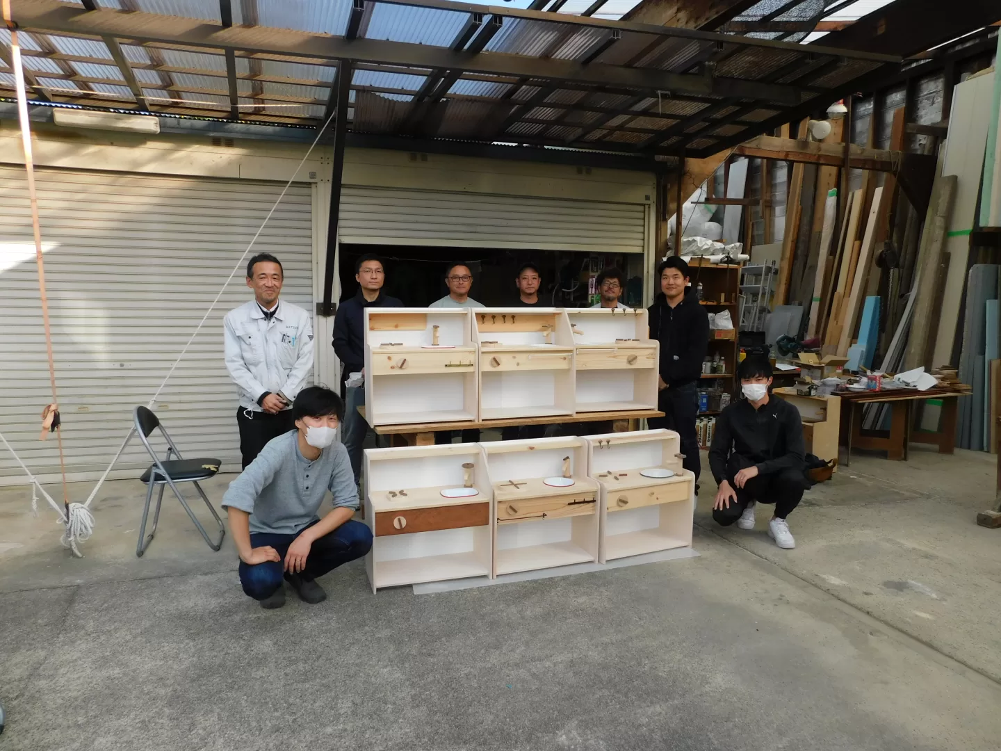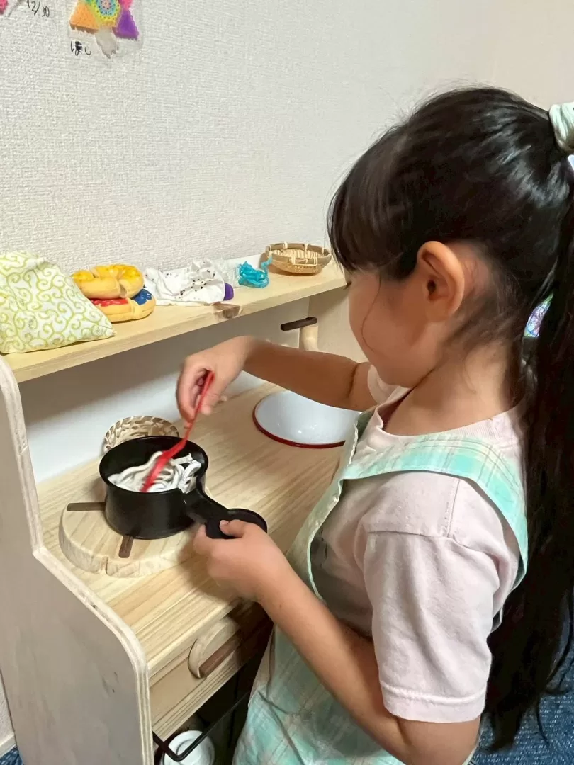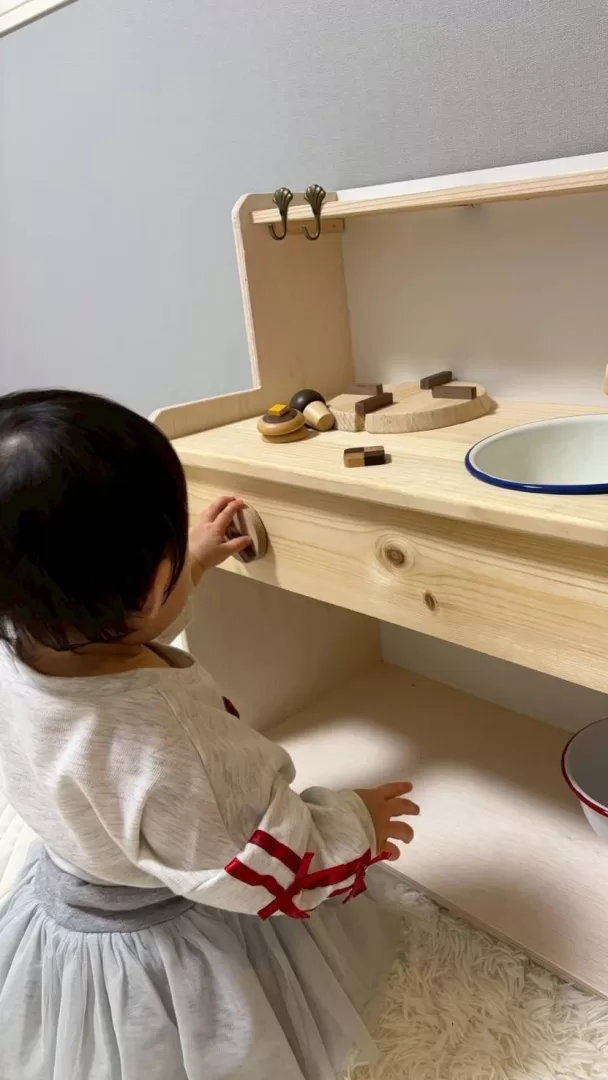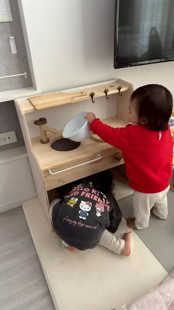完成したミニキッチンでお子さんたちが楽しそうに遊んでいる写真を送って頂きました。