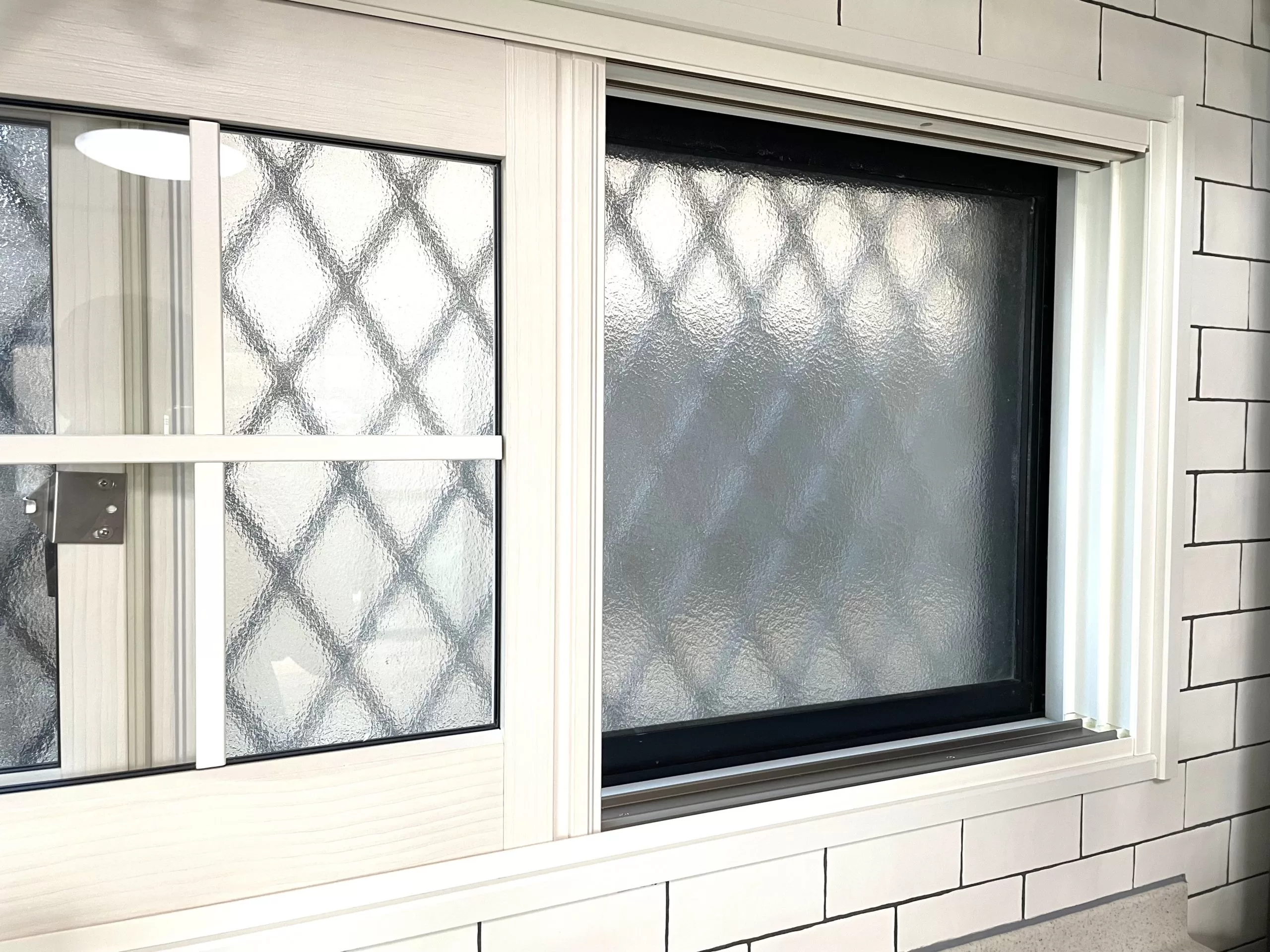 断熱力を上げるため各部屋にリクシルのインプラス内窓も取付、キッチンの前はウッドワンの可愛い格子型の内窓を取付しました。