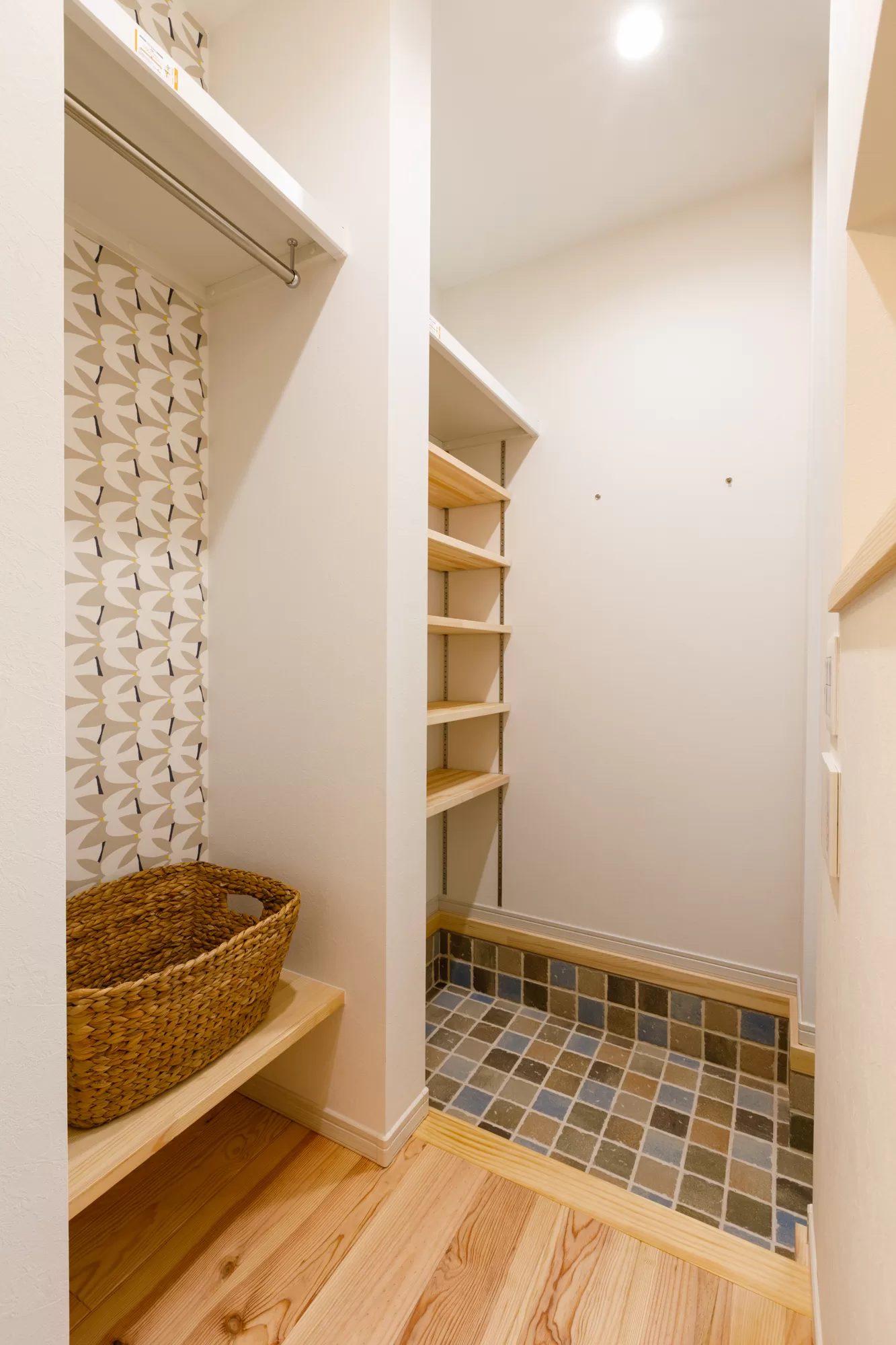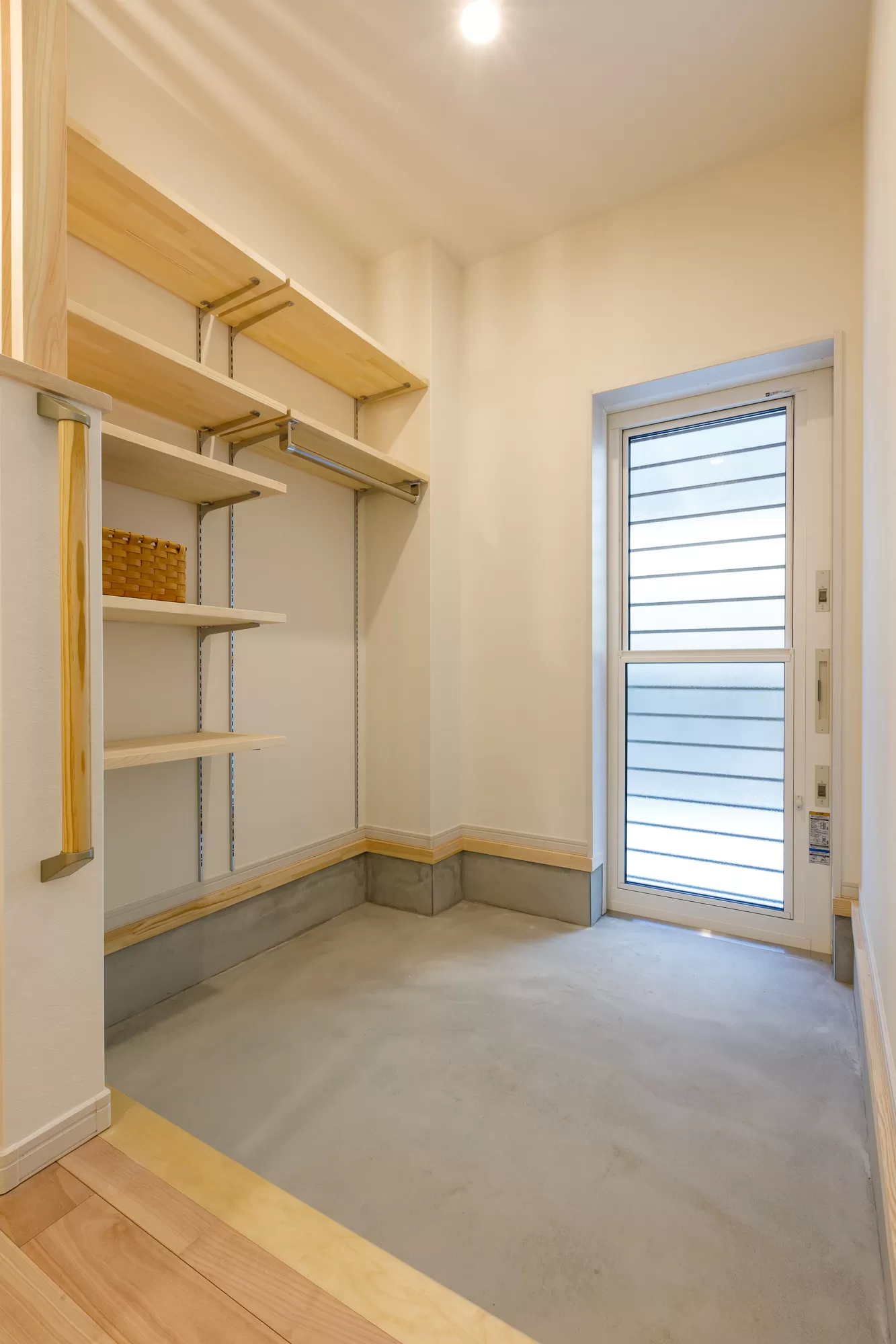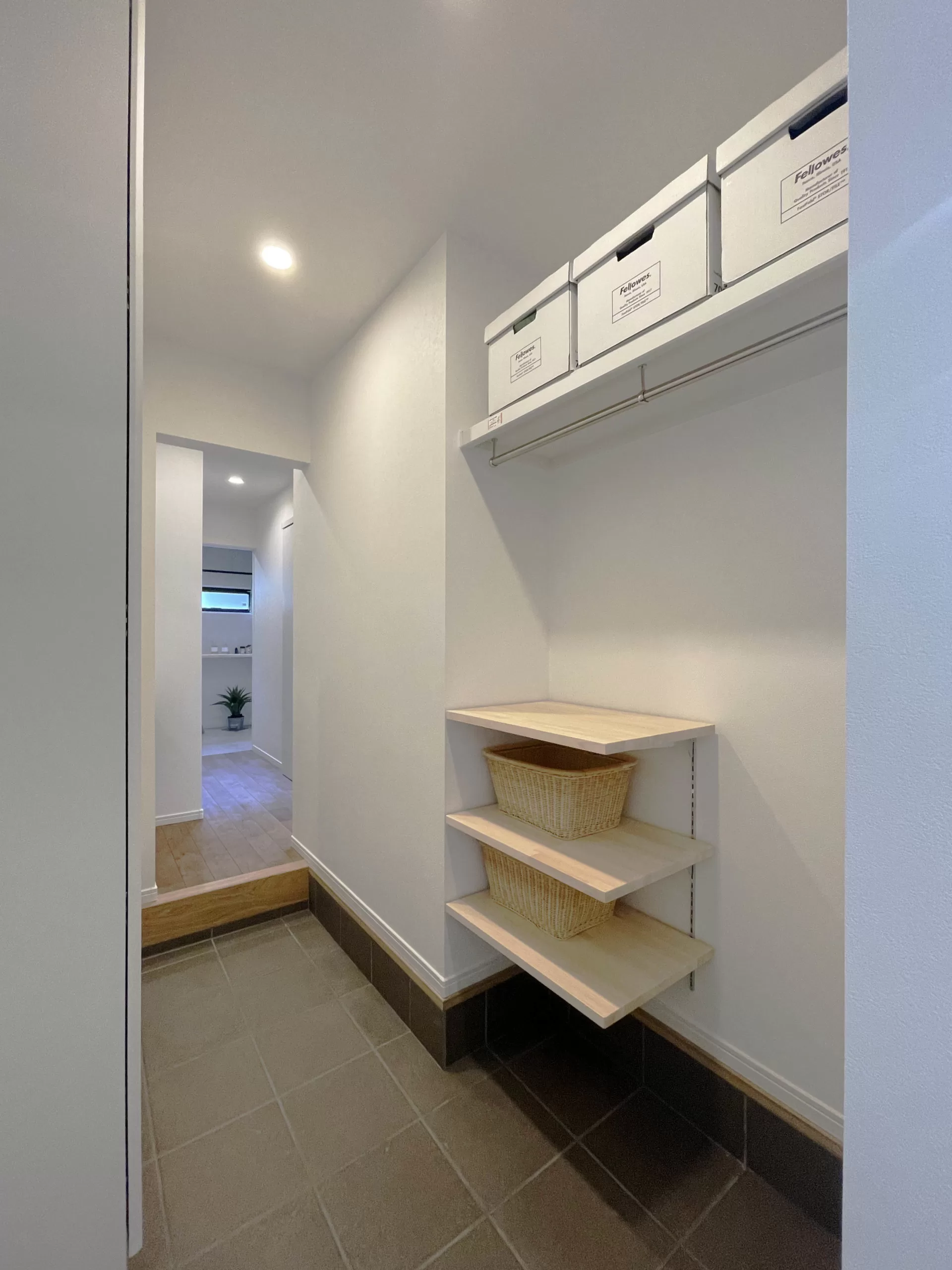 ↑こちらのお家は手前は高さの低い既製品の収納を取り付けて、奥にウォークインクローゼットのような大きな収納を設けてあります。