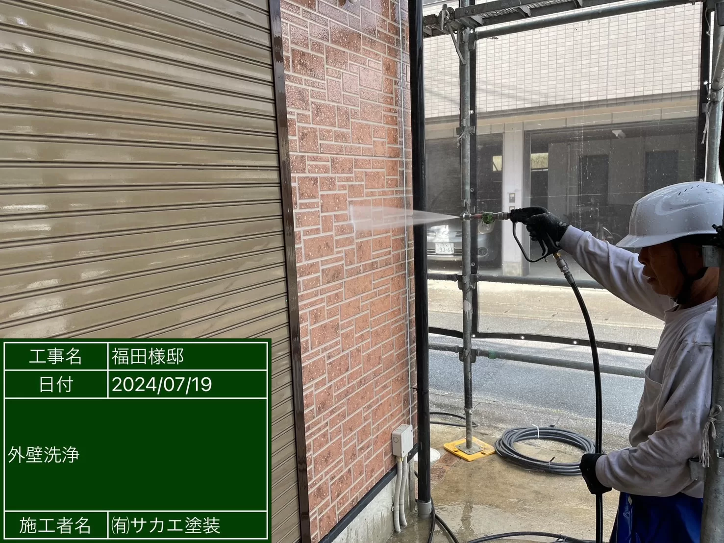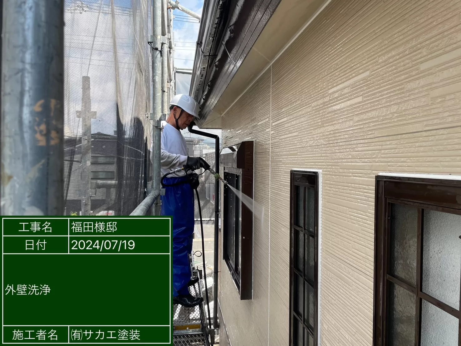 足場を架けて、高圧洗浄、コーキング打ち換えして養生、壁塗り工事していきます。