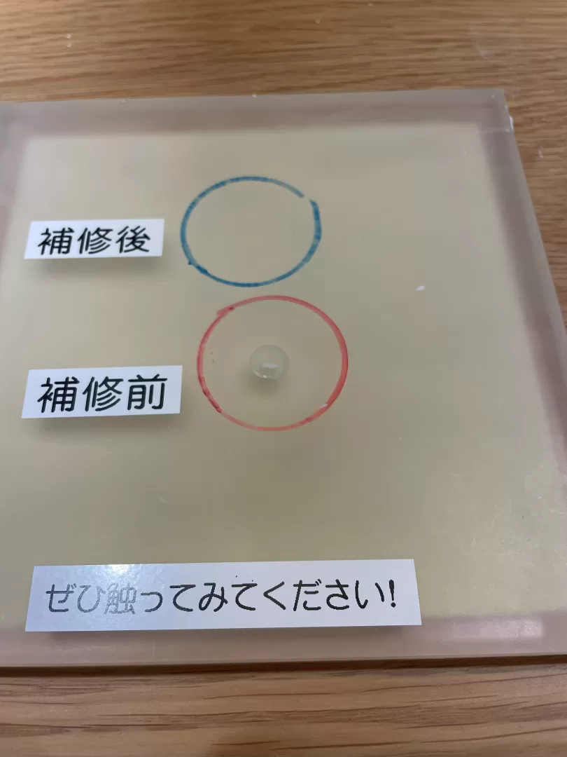エポキシ樹脂で作られていて、360℃まで耐えることができる丈夫なカウンターですが、万が一傷ついた場合でも修復できるということで修復作業を見せて頂きました。