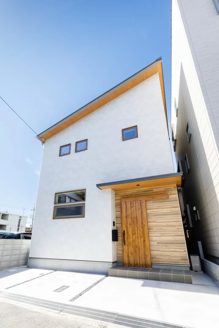 外観は片流れの屋根にシンプルな外観、窓も綺麗に配置されスタイリッシュに映えています。