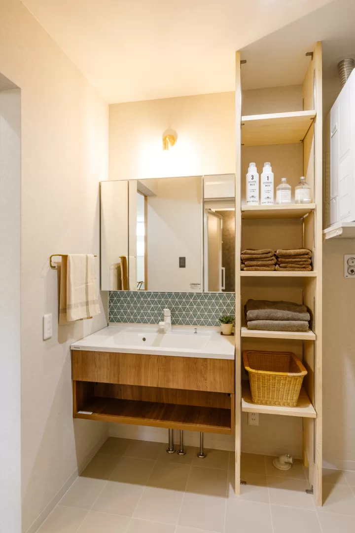 造作洗面台と収納ラックを設置。ここでもグレイッシュな△のタイルが目立っています。