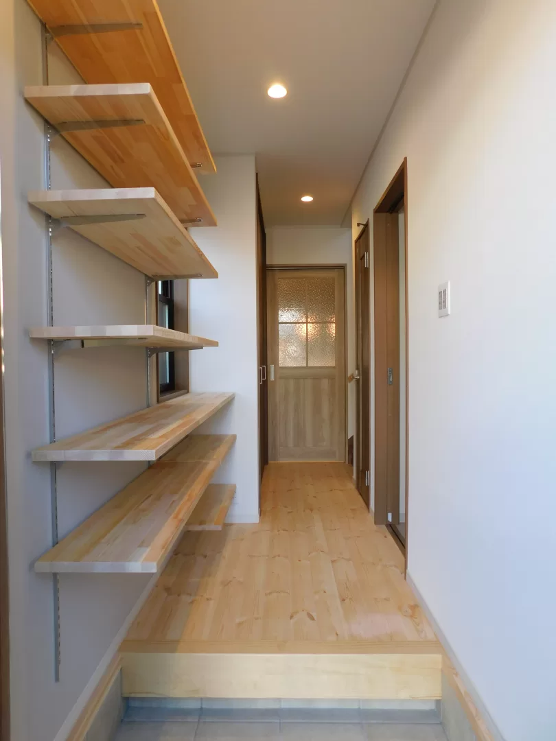 玄関はシューズクロークを取り、オープンの可動棚に。
