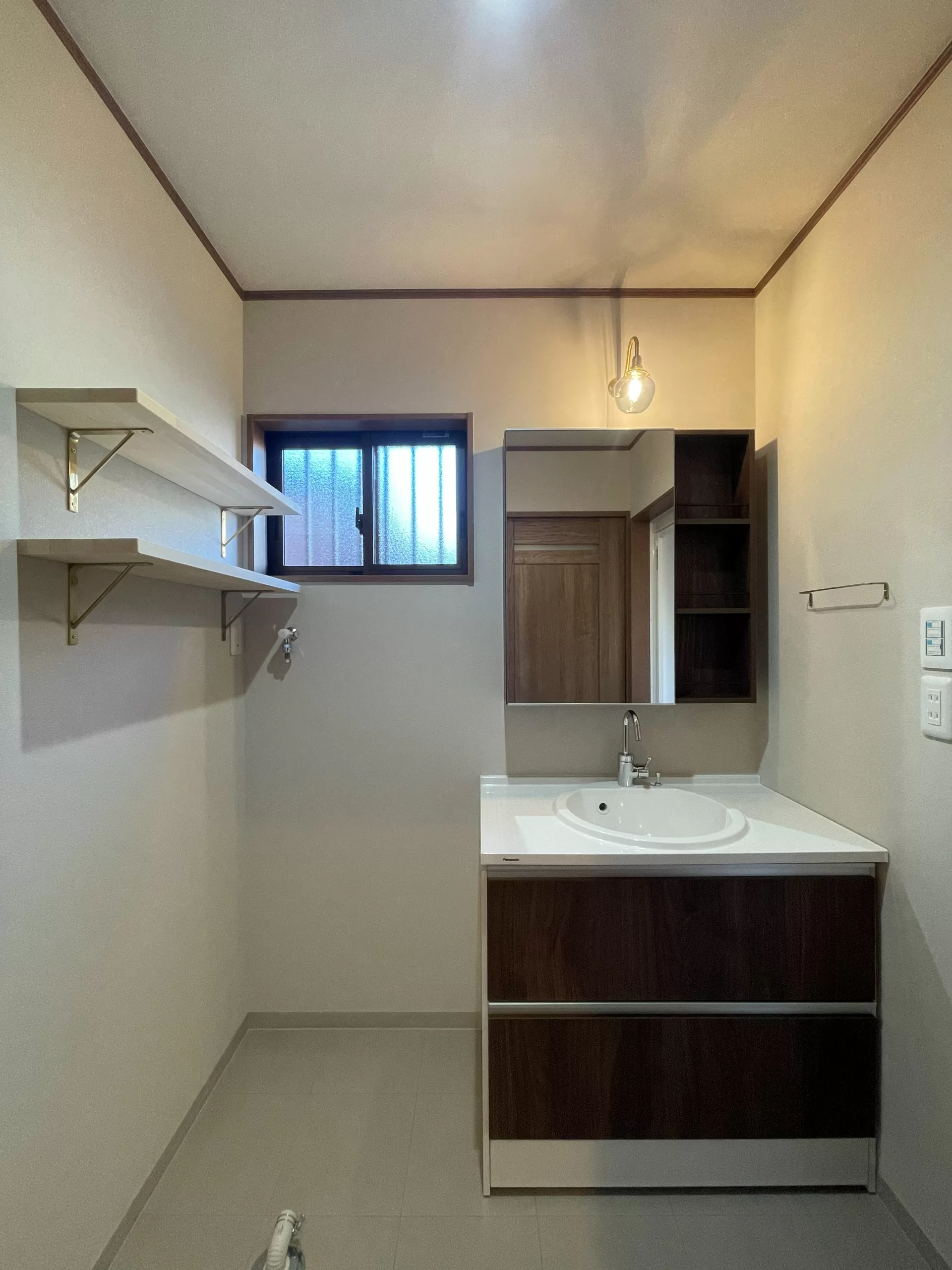 洗面台はパナソニックのシーラインで、カウンター部分がタイル調で、ボウル部分が丸くなっていて可愛いです。洗面台上には雑貨のブラッケット照明を取り付けました。ぽわんっと丸い形のグリーンのガラスシェードにお施主様も一目惚れ。