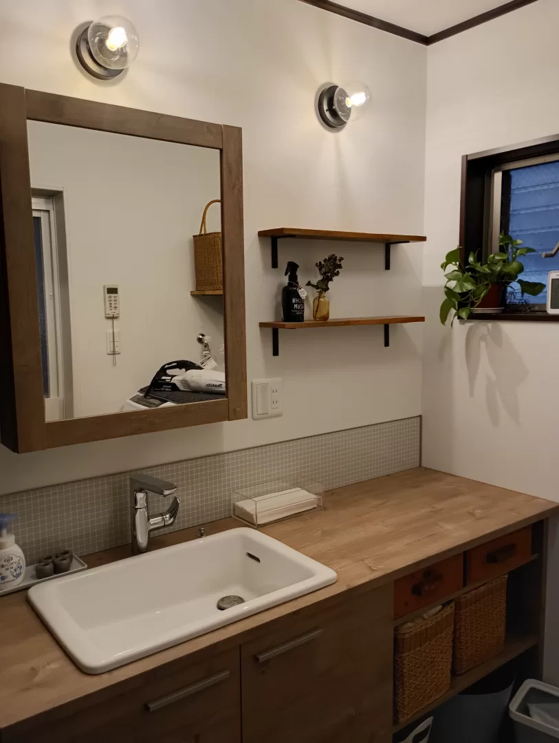 M様がお持ちの可愛いアンティーク雑貨の色合いや雰囲気が、洗面台や棚にぴったりマッチしていて、ショールームで見た以上に可愛い仕上がりになりました(^^)/