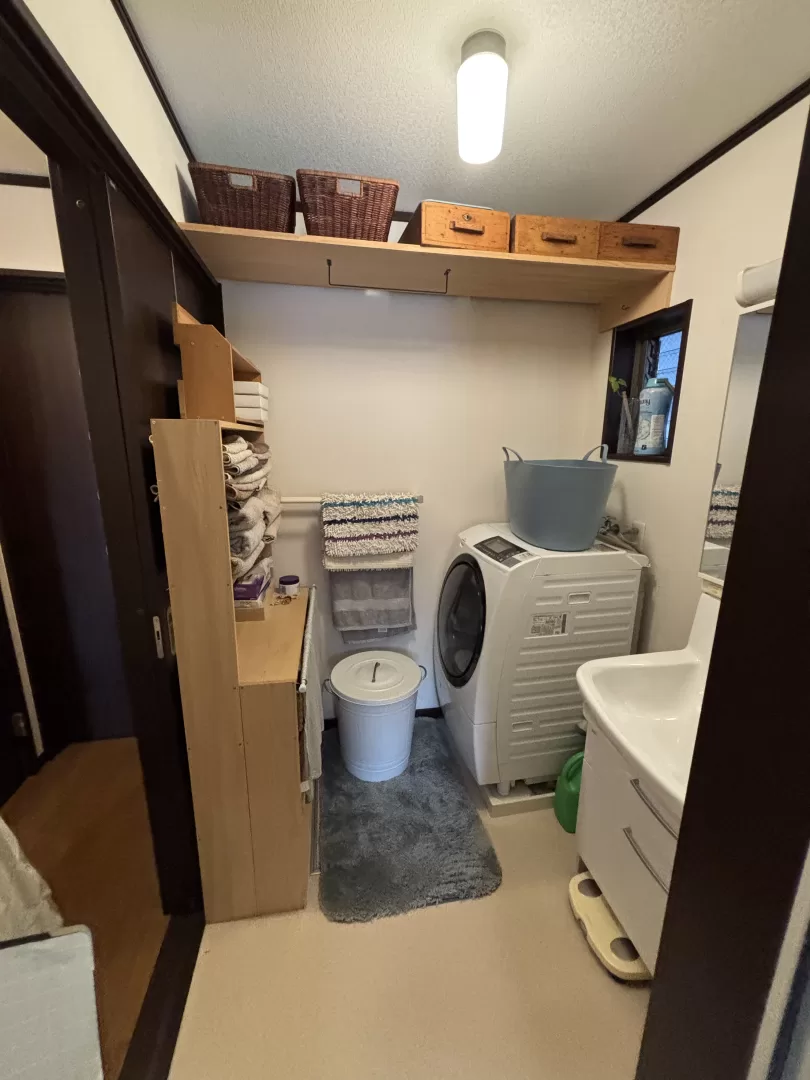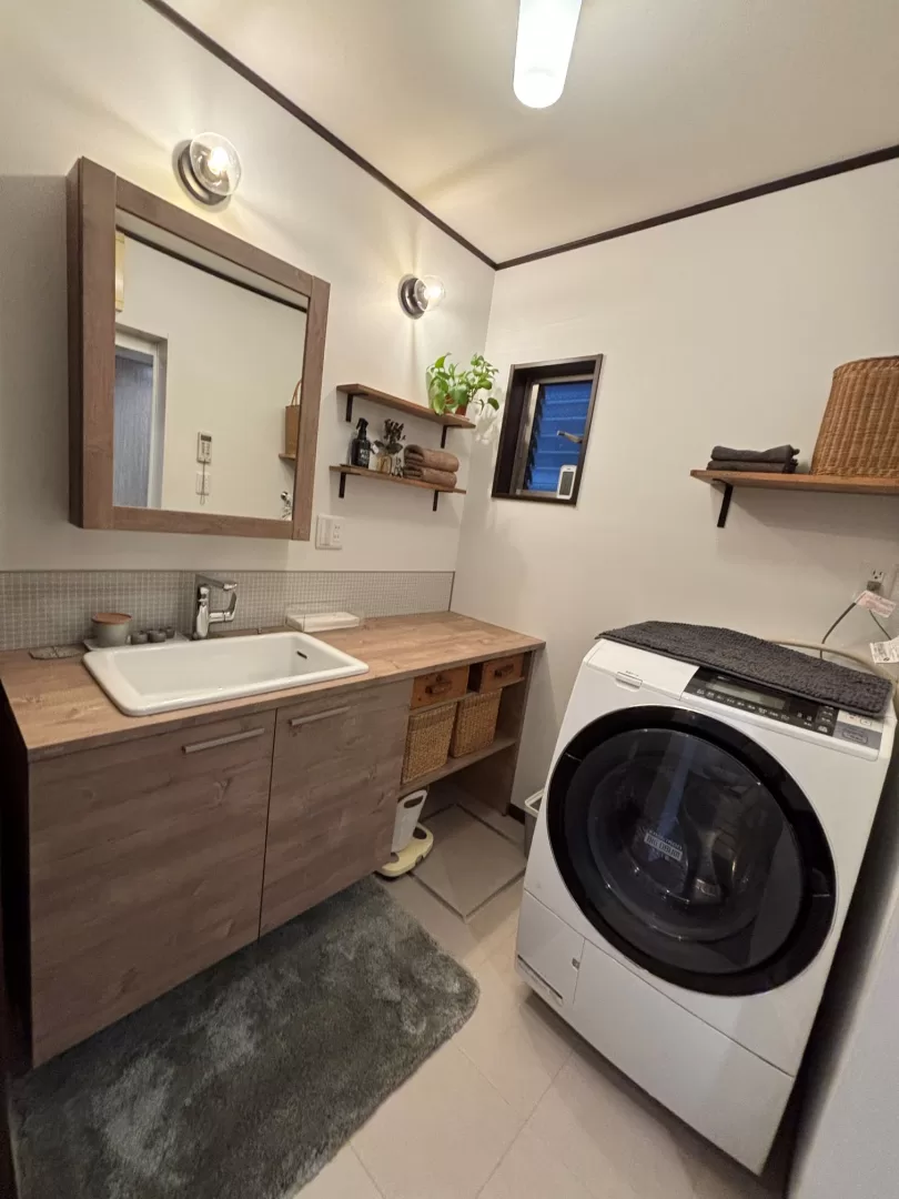 M様がお持ちの可愛いアンティーク雑貨の色合いや雰囲気が、洗面台や棚にぴったりマッチしていて、ショールームで見た以上に可愛い仕上がりになりました(^^)/